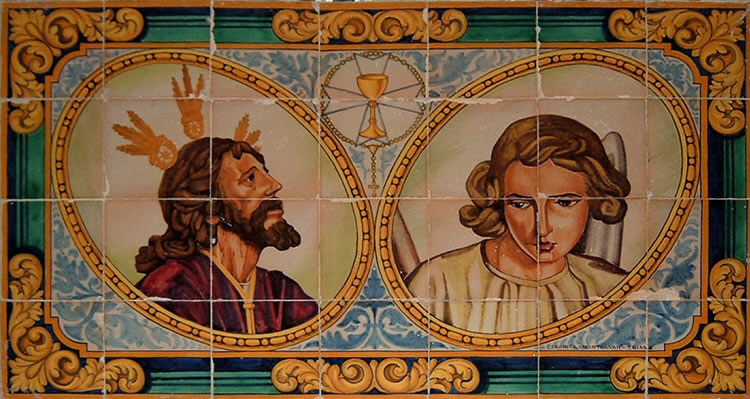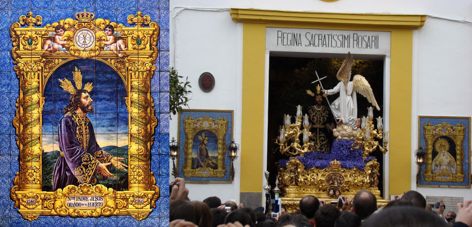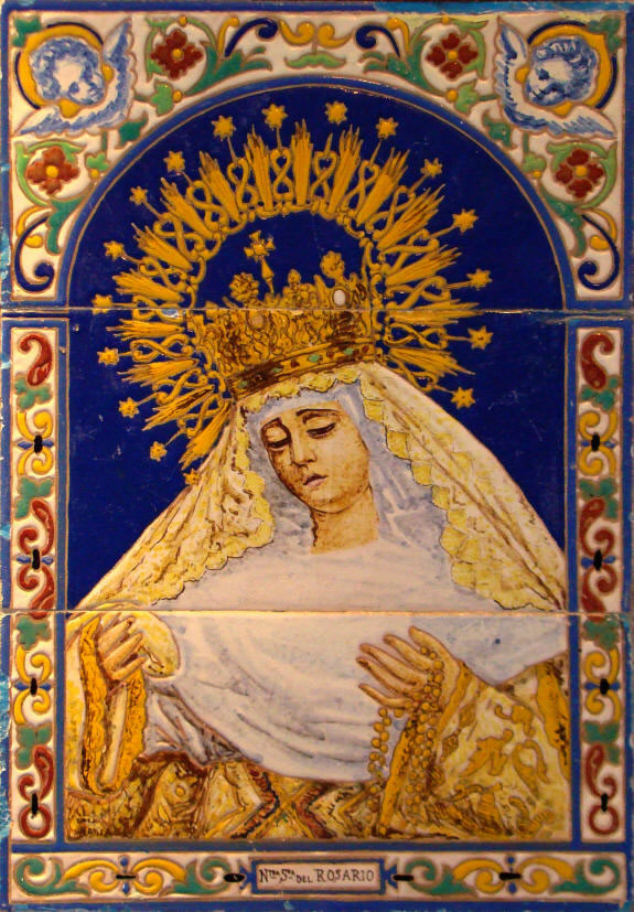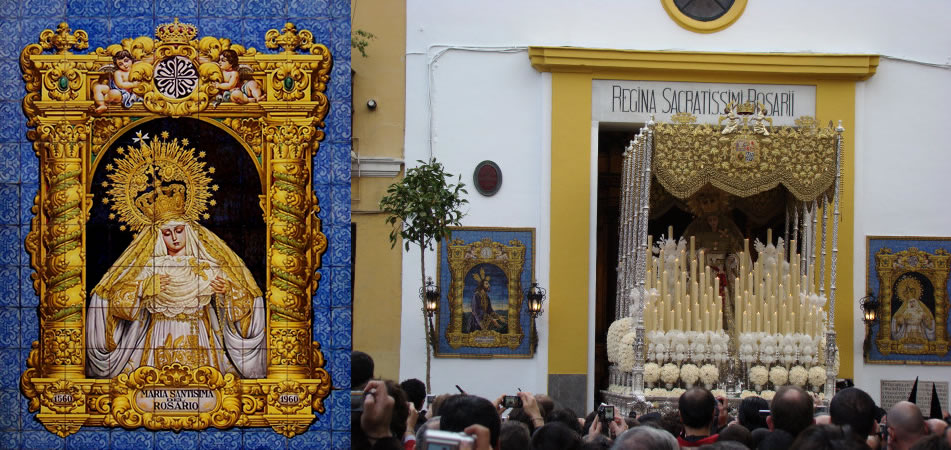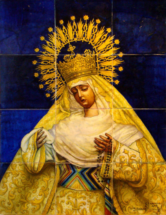 Más datos:Este retablo, junto con otro igual de la Virgen del Rosario, fueron donados a la Hermandad por el que fuera Hermano Mayor D. Luis Luca de Tena Luca de Tena (+1964), procedentes de la desaparecida casa familiar y fábrica de perfumes frente a la Capilla de Montesión. En un primer momento se colocaron en la sacristía, en 1978 pasaron a la puerta de su Casa de Hermandad en el compás y a principios de 2008 se han reubicado en la pared lateral del mismo.