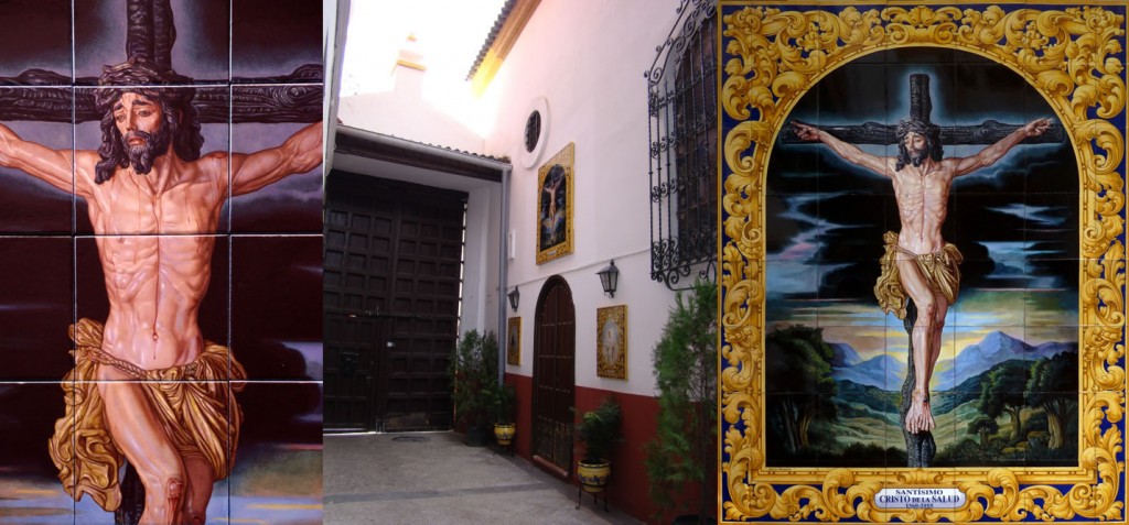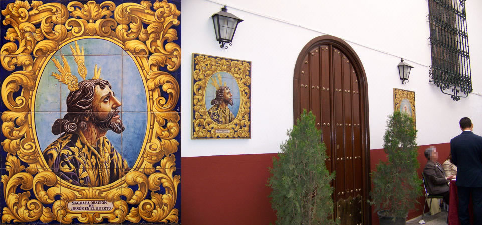 Más datos:Colocado con motivo del 450 Aniversario fundacional de la Hermandad. Bendecido el día 20 de diciembre por el Rvdo. P. D. Manuel Soria Campos, Delegado Diocesano de Hermandades. El marco decorativo es una adaptación de los retablos del Señor Orando en el Huerto y la Virgen del Rosario que flanquean la puerta, pintados por Alfonso Chaves Tejada a mediados de la centuria pasada. La fotografía del Santísimo Cristo que sirve de modelo es original de Daniel Villalba Rodríguez.