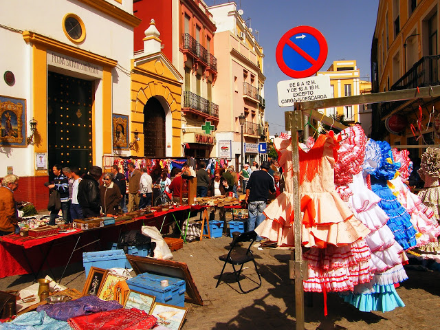 El barrio de la calle Feria, tiene un especial predicamento en Sevilla y, ello es debido, a que siempre ha formado un eje norte-sur comercial en nuestra Ciudad. Según Santiago Montoto en su libro Las Calles de Sevilla: “es esta una de las calles más famosas de la ciudad, formada por varias que tuvieron diversos nombres en lo antiguo. La propiamente llamada Feria y Ancha de la Feria comprendida desde la Plaza de los Maldonados a la de Calderón. El nombre de feria proviene de que se celebraba en estos lugares, harto notable -según Morgado- de todas las mercaderías, que se hace todos los jueves en la plaza y alrededor de la Iglesia Parroquial de Omnium Sanctorum. Ortiz de Zúñiga dice de este clásico mercado: sin saberse cuando tuvo principio, permanece un mercado los jueves de cada semana, que vulgarmente llaman feria, en ciertas calles de la Parroquia de Omnium Sanctorum, en que se hace; en el cual sitio asimismo se hacían las ferias antiguas, como consta de privilegios del rey Don Sancho, que le da ya este nombre. Fama tenían los bravos de estos lugares y ello se reconoce en los Romances de Germania y en el Rufián Dichoso Cervantes.