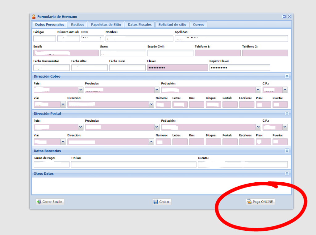 Una vez pinchéis en «entrar» se abrirá vuestra ficha de hermano, en cuya parte inferior derecha aparecerá el botón «PAGO ONLINE», pulsando en este podréis efectuar el pago de las cuotas pendientes.