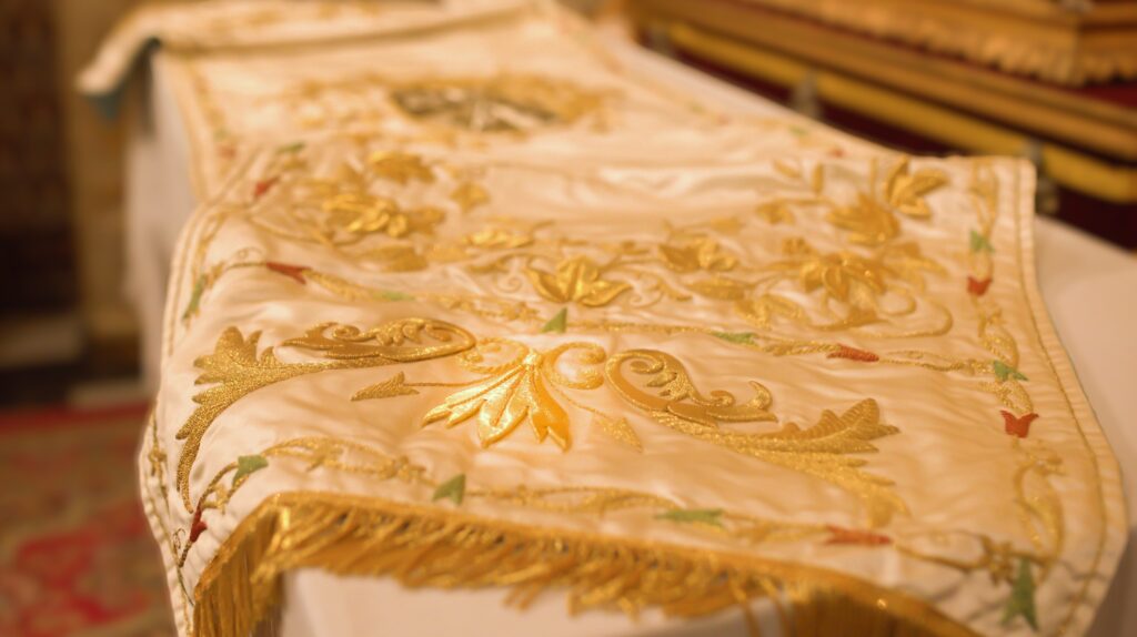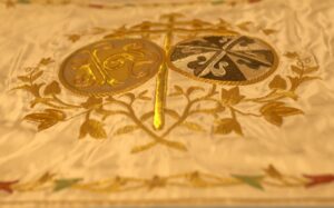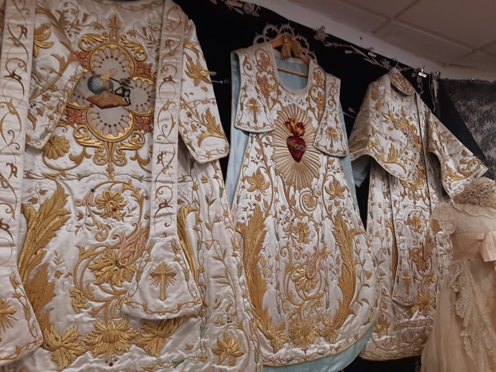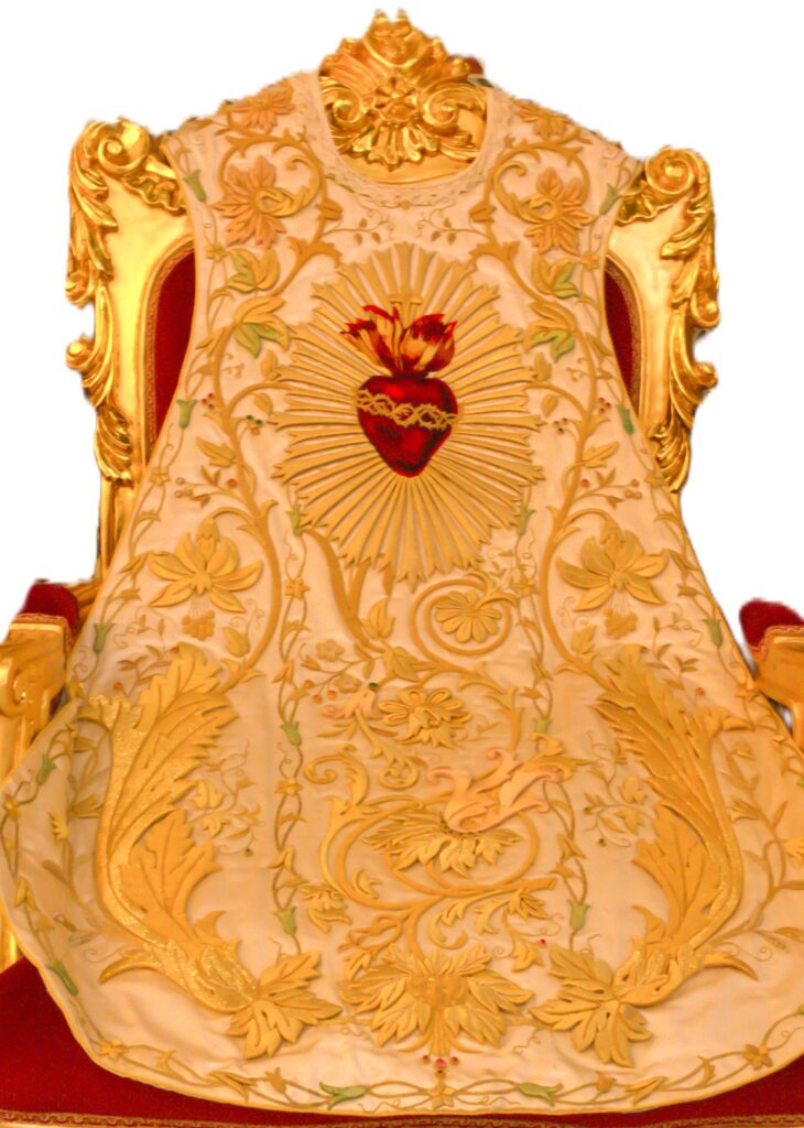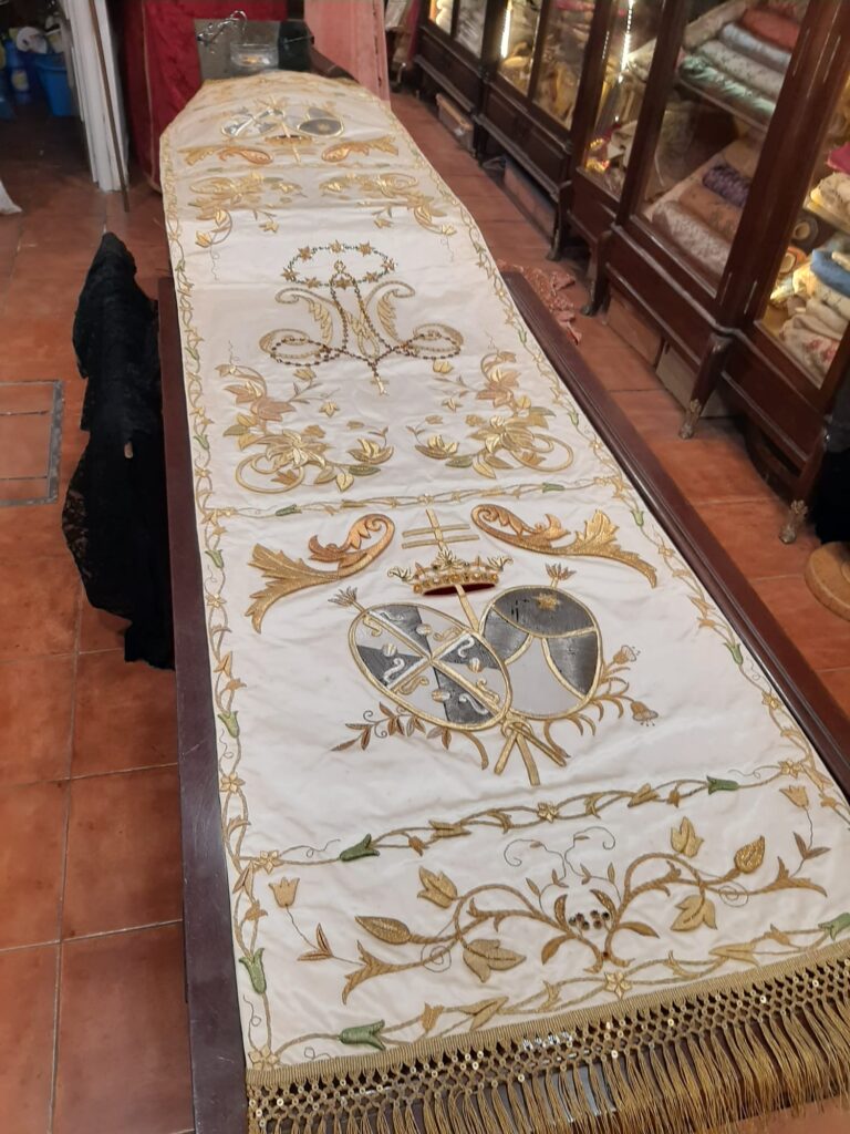 Este año la Hermandad ha realizado una importante apuesta patrimonial en lo referente al AJUAR LITÚRGICO, que pasará a contar un conjunto textil de altísima calidad y de gran esplendor, con un valor artístico de primer orden. Procedente de un antiguo convento dominico aragonés, se trata de un terno de finales del S. XIX bordado en oro fino a realce, el cual consta de todos los puntos del bordado, donde sobresale la cartulina o el cetillo de media onda. El conjunto lo integran también numerosas bordadas primorosamente en sedas, donde predominan los símbolos y escudos dominicos.