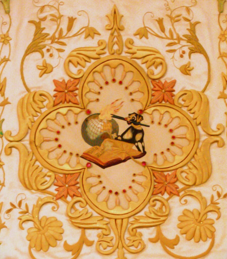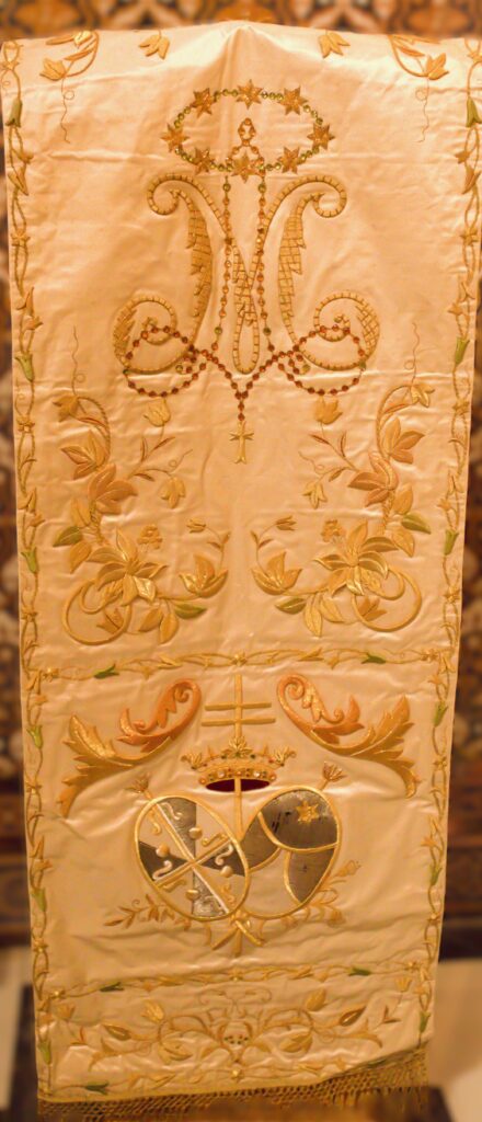 El juego también comprende un paño cubreambón y un paño de hombros para uso sacramental, ambos también de color blanco y bordado en oro con los escudos dominicos en seda blanco y negro. El conjunto lo completa cubrecáliz y palia bordado a juego con las demás piezas.