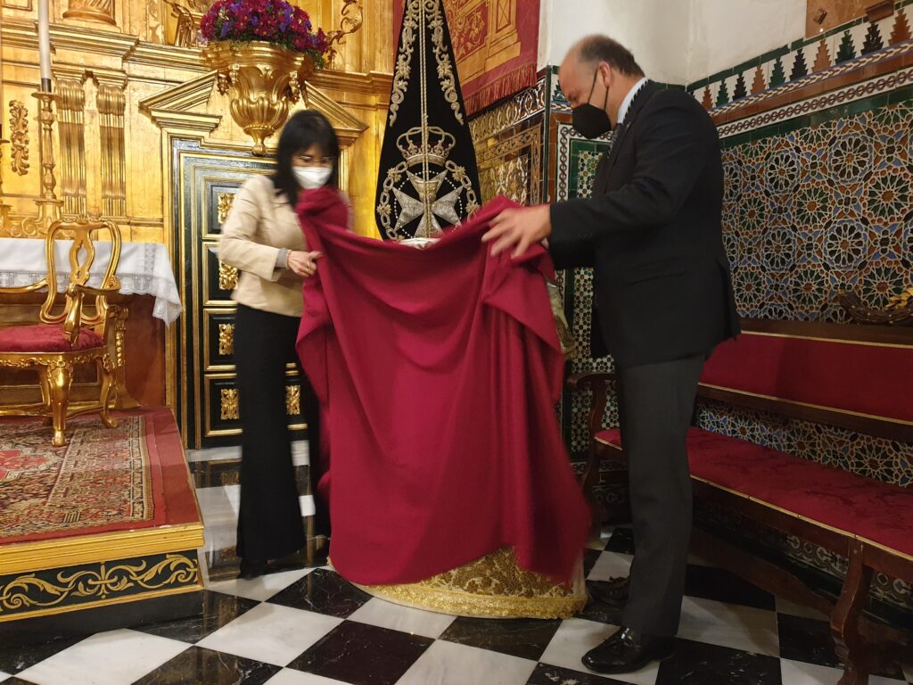 La presentación tuvo lugar el 8 de mayo a la conclusión de la Sabatina a la Stma Virgen del Rosario. Los trabajos han sido desarrollados en el Taller de Oro Bordados, de la localidad sevillana de Brenes, bajo la dirección de Dolores Fernández.
