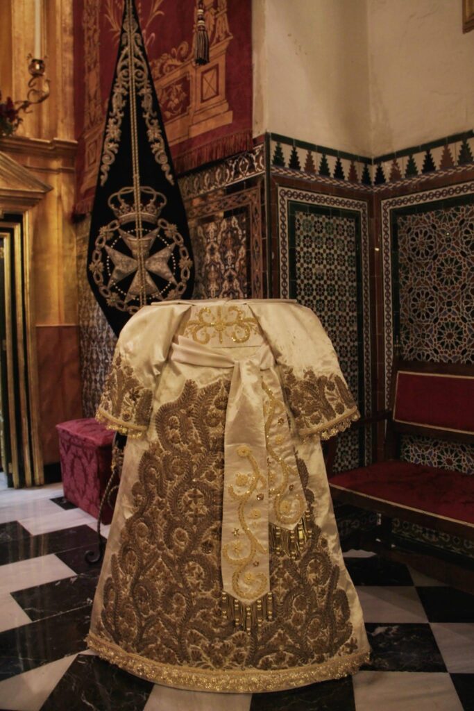 Dentro de la constante labor de mejora y mantenimiento de nuestro patrimonio, se ha procedido a la restauración de la saya blanca de la Stma Virgen del Rosario, que fuera donada a principio del S.XX por el torero Rafael «El Gallo», y confeccionada con los bordados de uno de sus trajes de luces sobre soporte de seda.